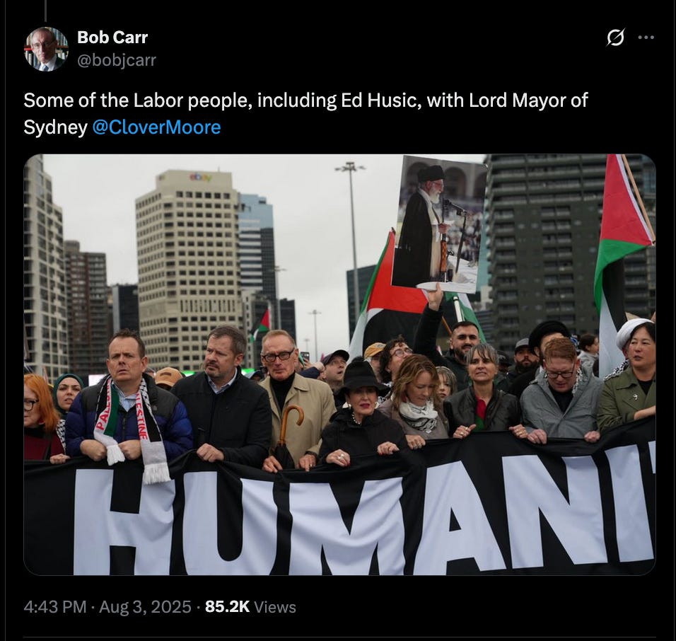 Mr Husic and co claimed they marched in front of the Ayatollah’s image unwittingly. But Mr Carr willingly promoted the image by posting it to his social media channels.