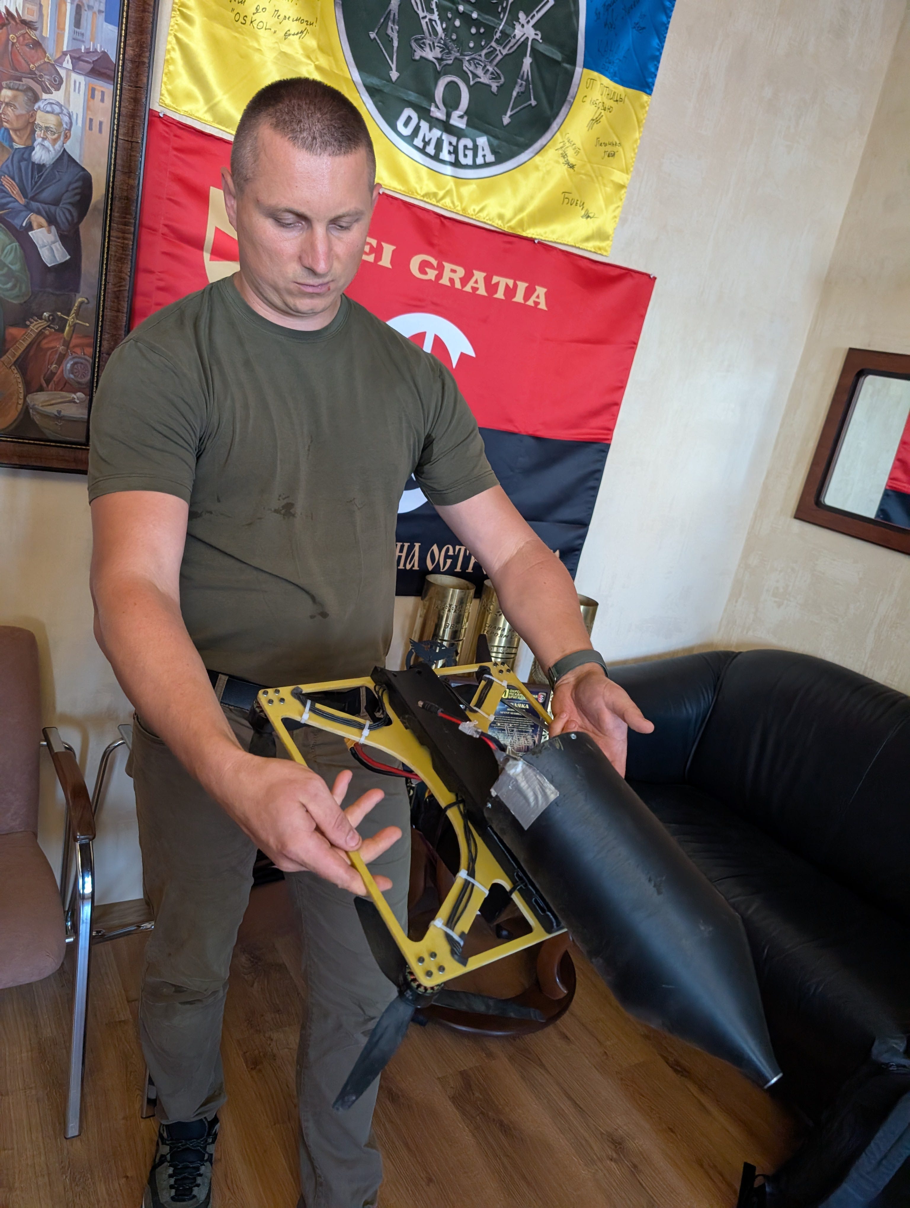 He holds a thin metal square frame with four rotors on each corner, dressed with electric wires fixed down by a bunch of cheap white plastic cable ties.