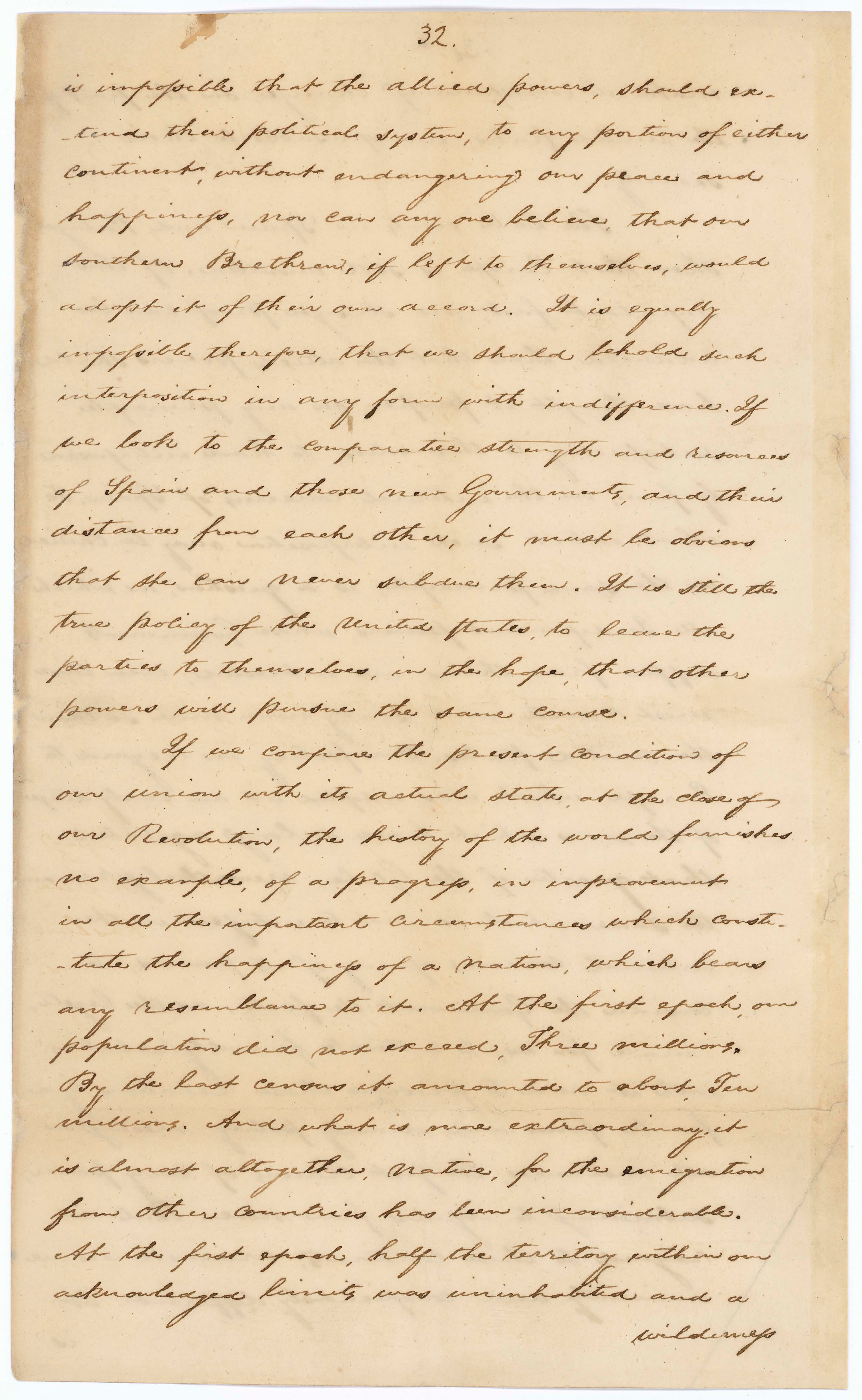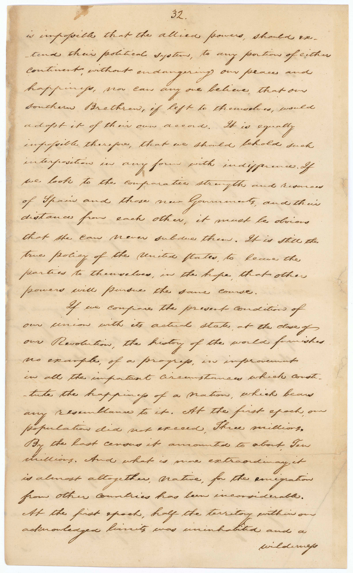 With the movements in this hemisphere, we are of necessity more immediately connected, and by causes which must be obvious to all enlightened and impartial observers. The political system of the Allied powers is essentially different in this respect from that of America. This difference proceeds from that which exists in their respective Governments; and to the defence of our own, which has been achieved by the loss of so much blood and treasure, and matured by the wisdom of their most enlightened citizens, and under which we have enjoyed unexampled felicity, this whole nation is devoted.